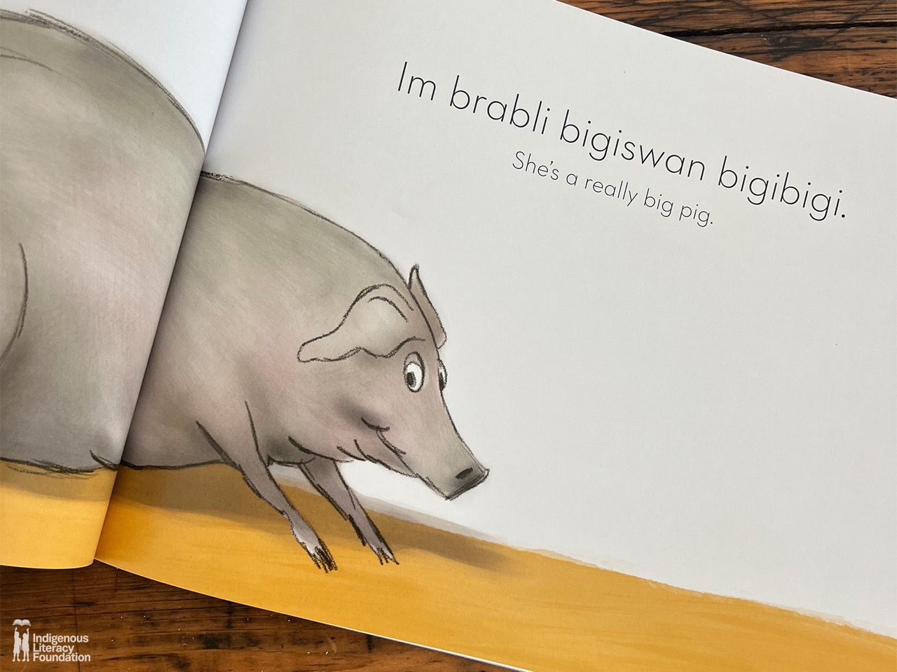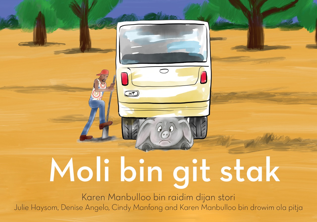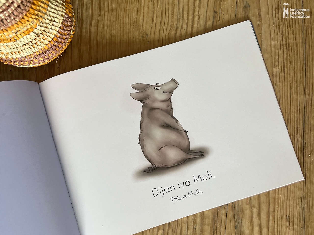 Moli det bigibigi (Molly the pig) was written by Karen Manbulloo and published by the Indigenous Literacy Foundation (ILF) in 2017. The picture book shares the adventures of local pig, Moli (Molly), and how she eats weetabix to grow strong and scare away the camp dogs.